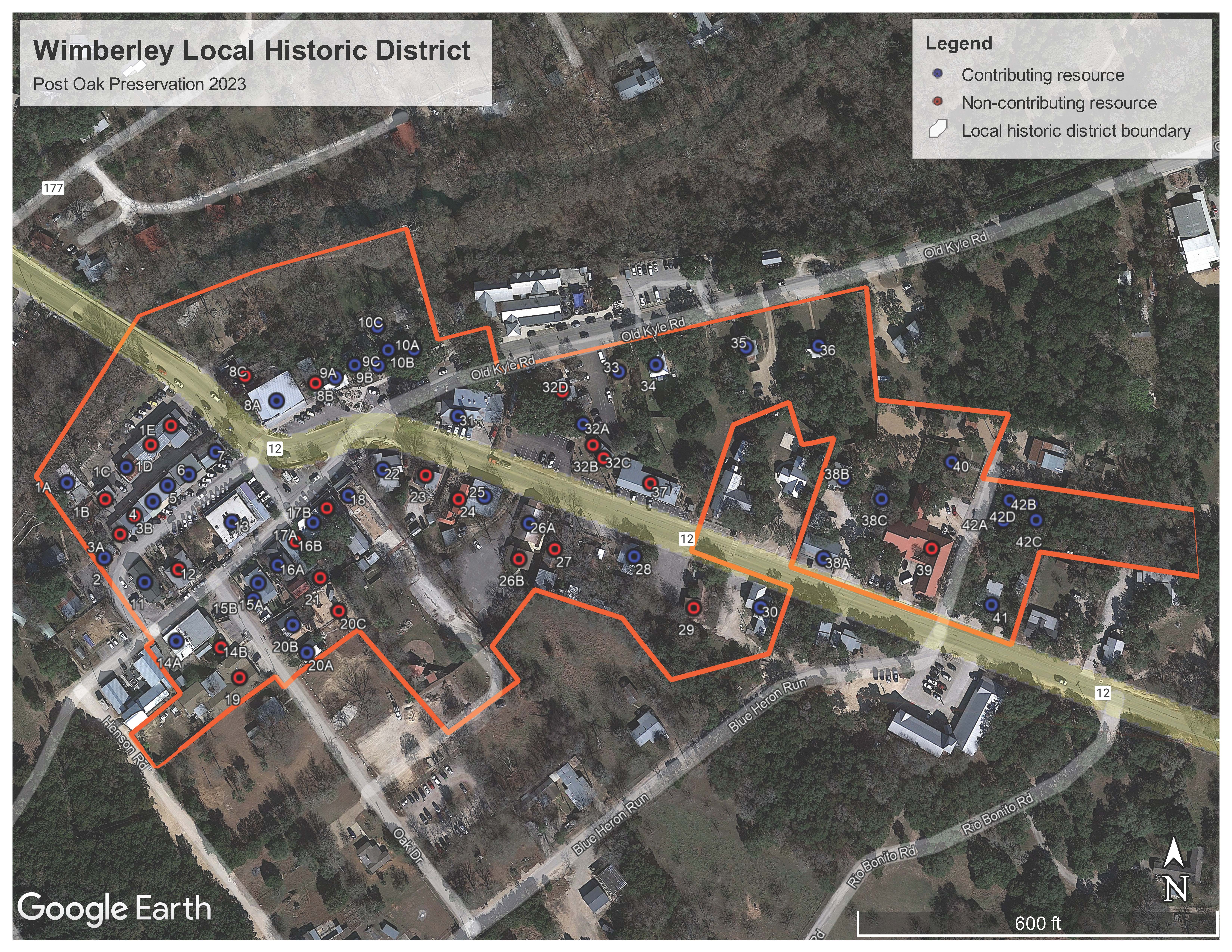 Post Oak Preservation Solutions will be conducting a survey of downtown Wimberley on June 13-14, 2022. They will be wearing brightly colored vests and taking pictures of buildings from FM 3237 to Brookshire Brothers on Ranch Road 12. The purpose of this survey is to develop a report and historic district map that identifies contributing and non-contributing resources for a National Register of Historic Places district nomination. Information can be found HERE