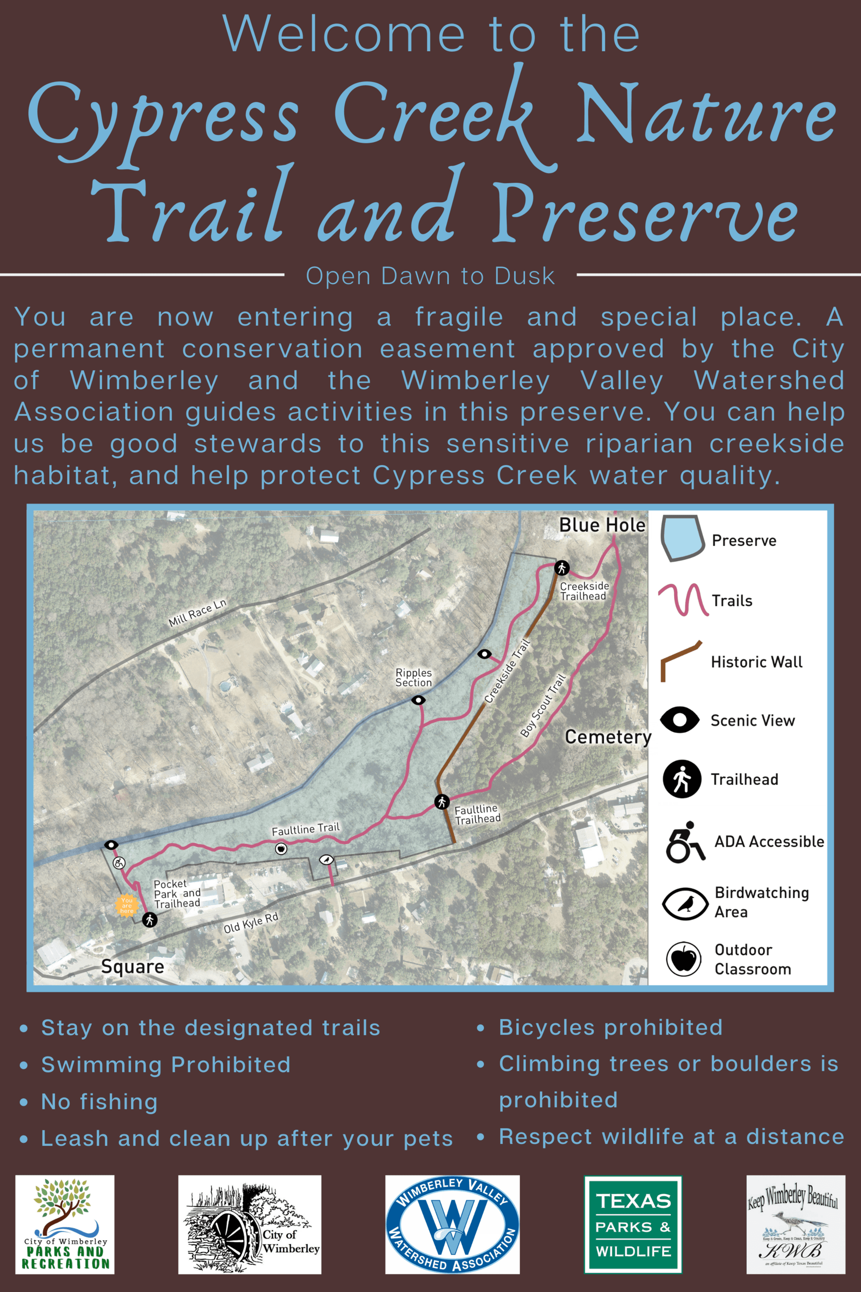 The City of Wimberley has developed 7.24 acres of land along Cypress Creek into a protected preserve and nature trail. This park is located immediately east of the Wimberley Square, bordered by Cypress Creek and Old Kyle Road. The park was acquired in 2001 by the City and features a walking trail along Cypress Creek connecting to Blue Hole Regional Park. At the time of the acquisition, a conservation easement was entered into between the City of Wimberley and the Wimberley Valley Watershed Association.